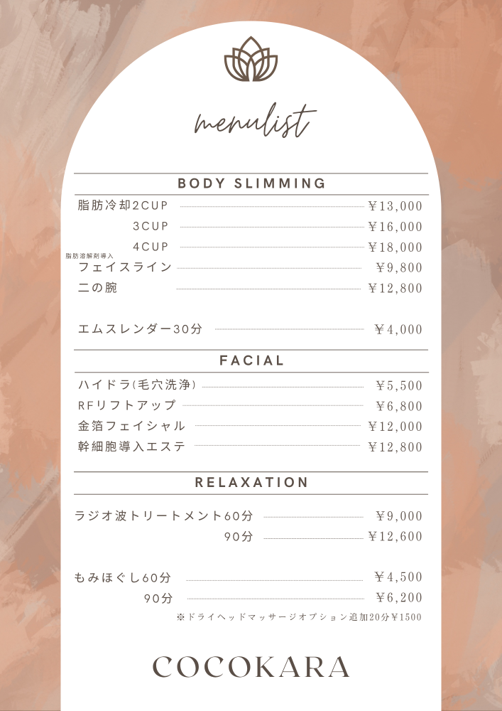 当店をご利用の前に、以下の注意事項を一読ください。・当日、体調などにより施術出来ない場合があります。・痩身メニューをご予約の方は施術の前後2時間は食事を控えてください。・飲酒されている方の施術はお断りしています。・キャンセルは、ご予約日の前日までにご連絡をお願いいたします。
